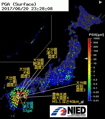 最大震度4以上の地震があったみたい23:27:51 震度3 大分 #強震モニタ (強震モニタExtension)を利用した速報です https://t.co/xRMELp6K83