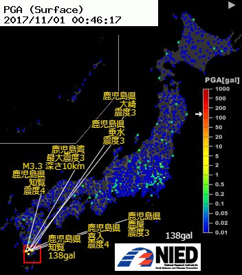 最大震度4以上の地震があったみたい00:46:16 震度4 鹿児島 #強震モニタ (強震モニタExtension)を利用した速報です https://t.co/UyofqqTon9