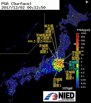 最大震度4以上の地震があったみたい00:12:38 震度4 茨城 震度3 群馬 栃木 埼玉 東京 震度2 神奈川 千葉 #強震モニタ (強震モニタExtension)を利用した速報です https://t.co/ZGazrjAga6