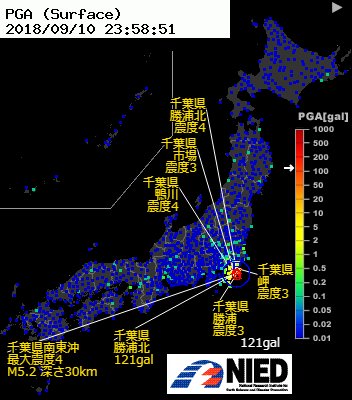千葉県南東沖M4.8 dep=30km (最大震度4以上の地震があったみたい23:58:46 震度4 千葉)