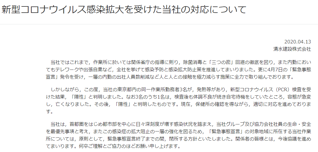 スーパーゼネコンさんの工事関係者が、新型コロナウイルスでお亡くなりになったらしい。