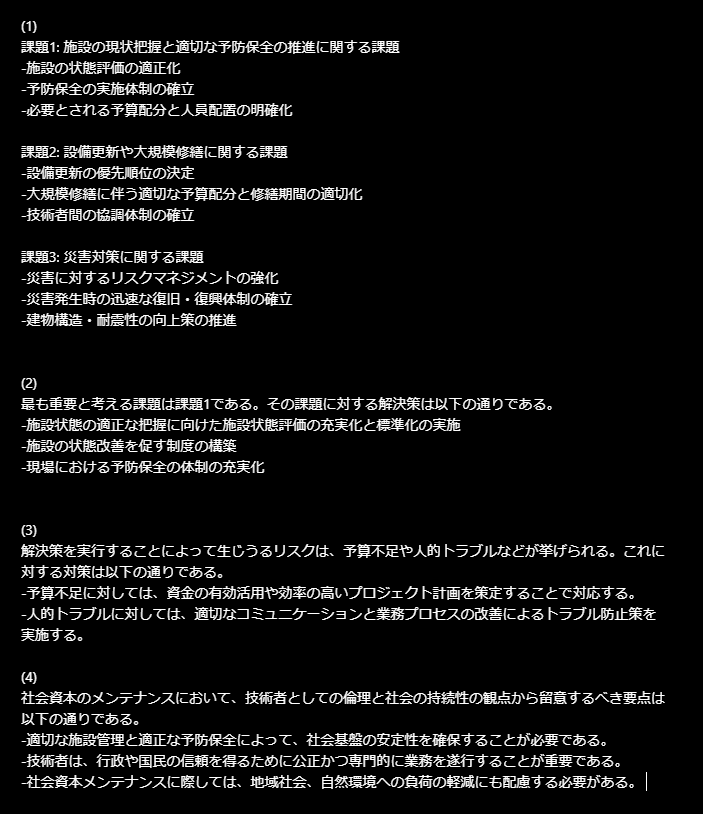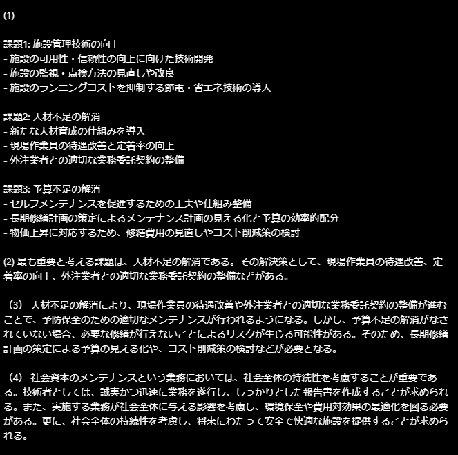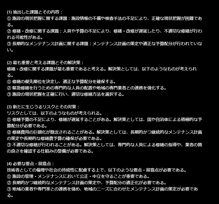 令和5年度技術士二次試験必須科目I-2の問題をChatGPTさんにやってみてもらった。