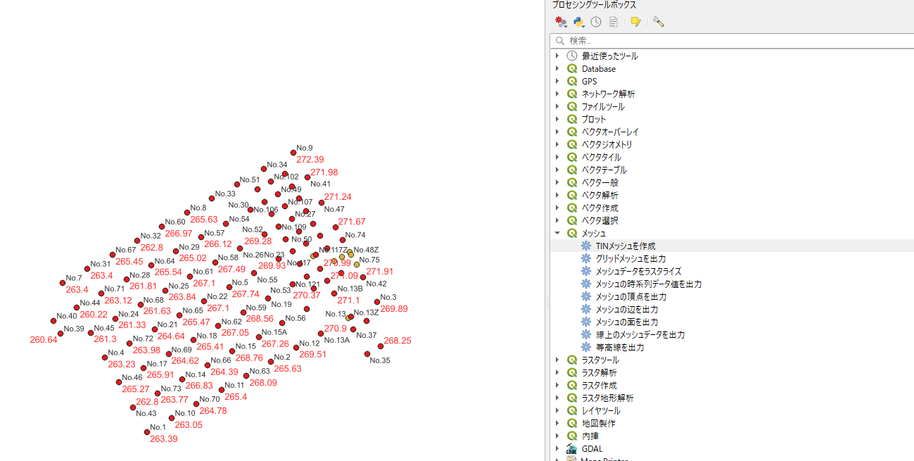 [プロセシングツールボックス]-[メッシュ]-[TINメッシュを作成]を選択する。