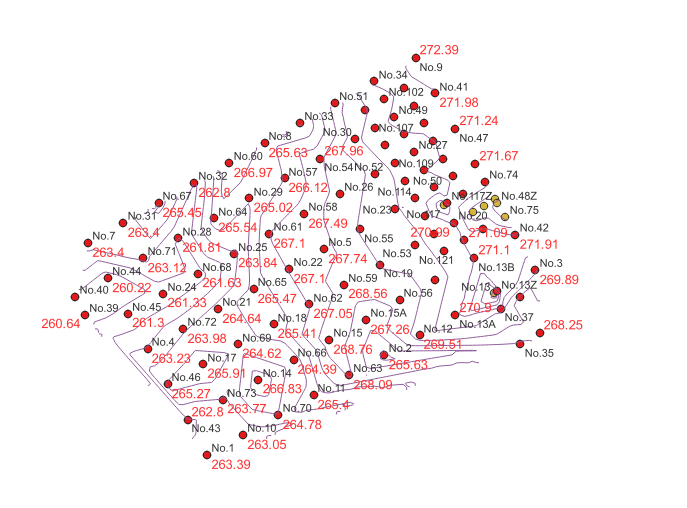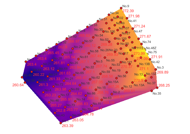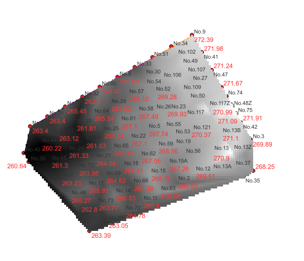 このような配点した状態で、各点に標高データが付いています。