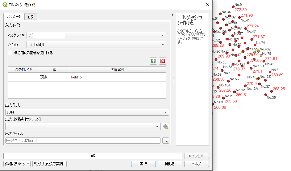 TINメッシュを作成すると選ぶと上記の画面がでるので、ベクタレイヤをCSVを入れたレイヤに指定する。