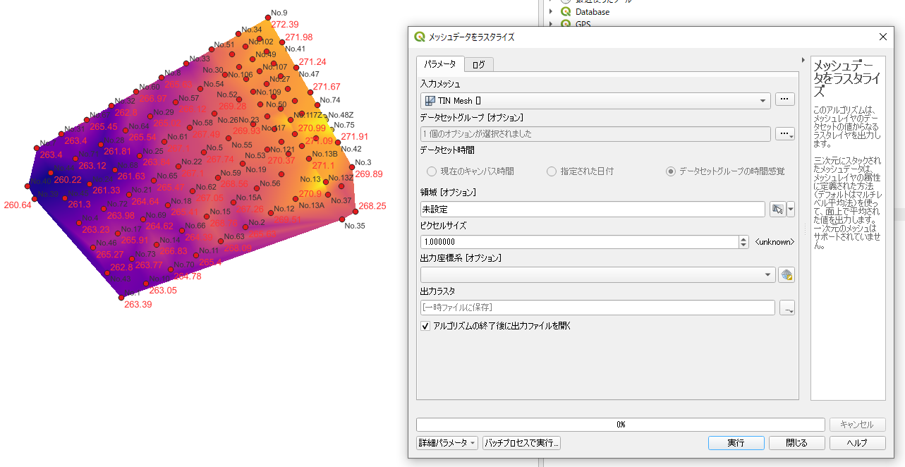 入力メッシュは先ほど作成したTIN。それを実行するとラスタライズしてくれる。