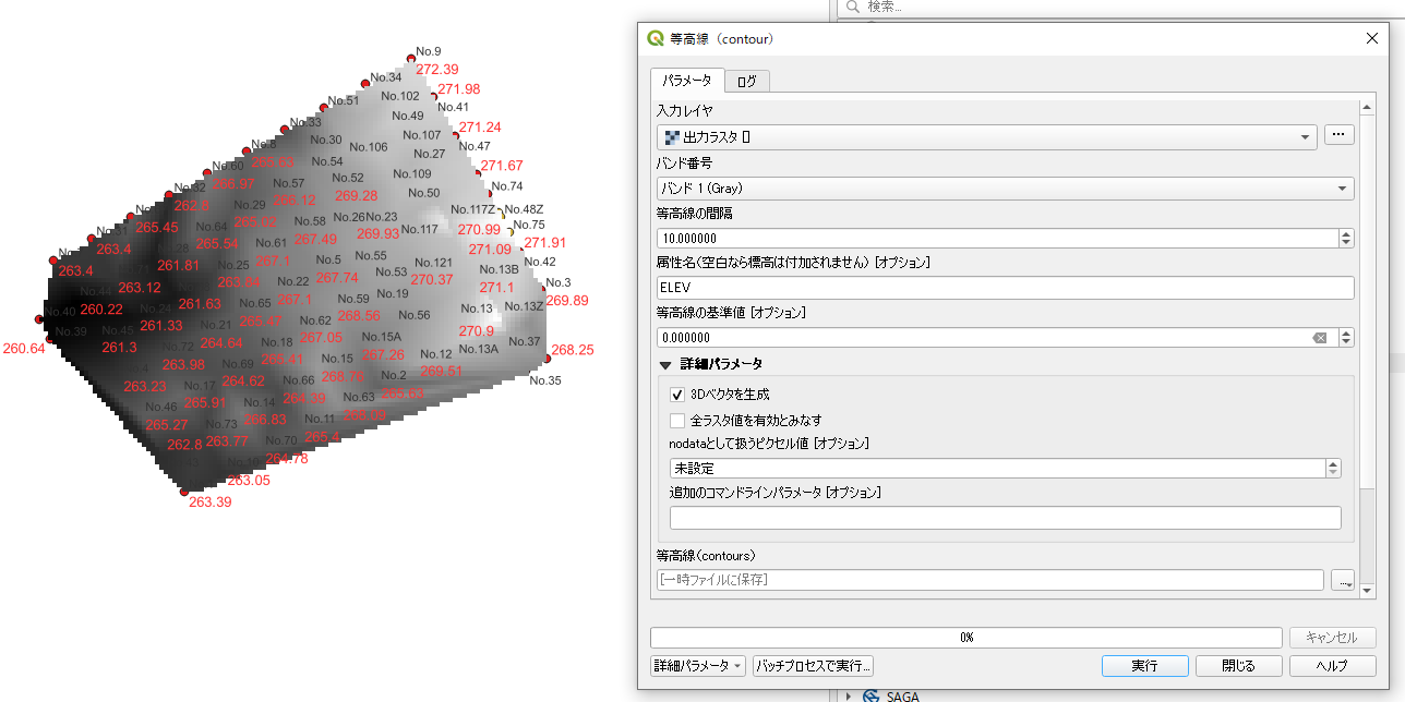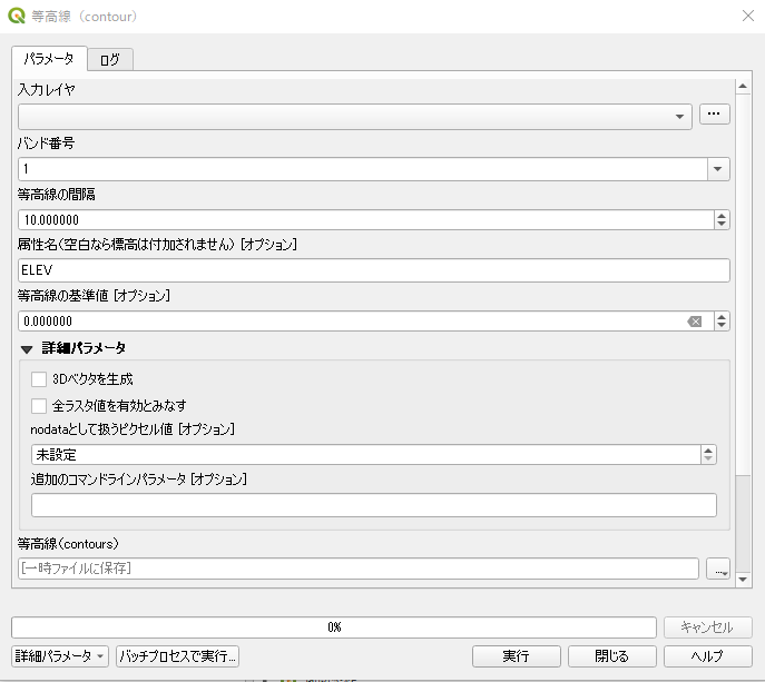 [ラスタ]-[抽出]-[等高線]のコマンドを動かす。