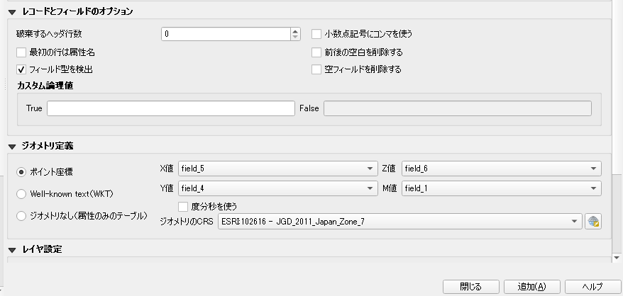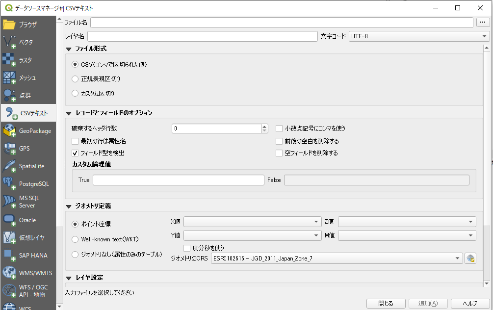 [レイヤ]-[レイヤを追加]-[CSVテキストレイヤを追加]をするを選択すると上記の画面がでる。