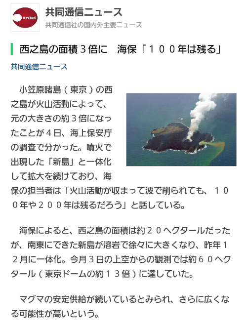 西之島の面積3倍に 海保「100年は残る」 – 47NEWS(よんななニュース)
